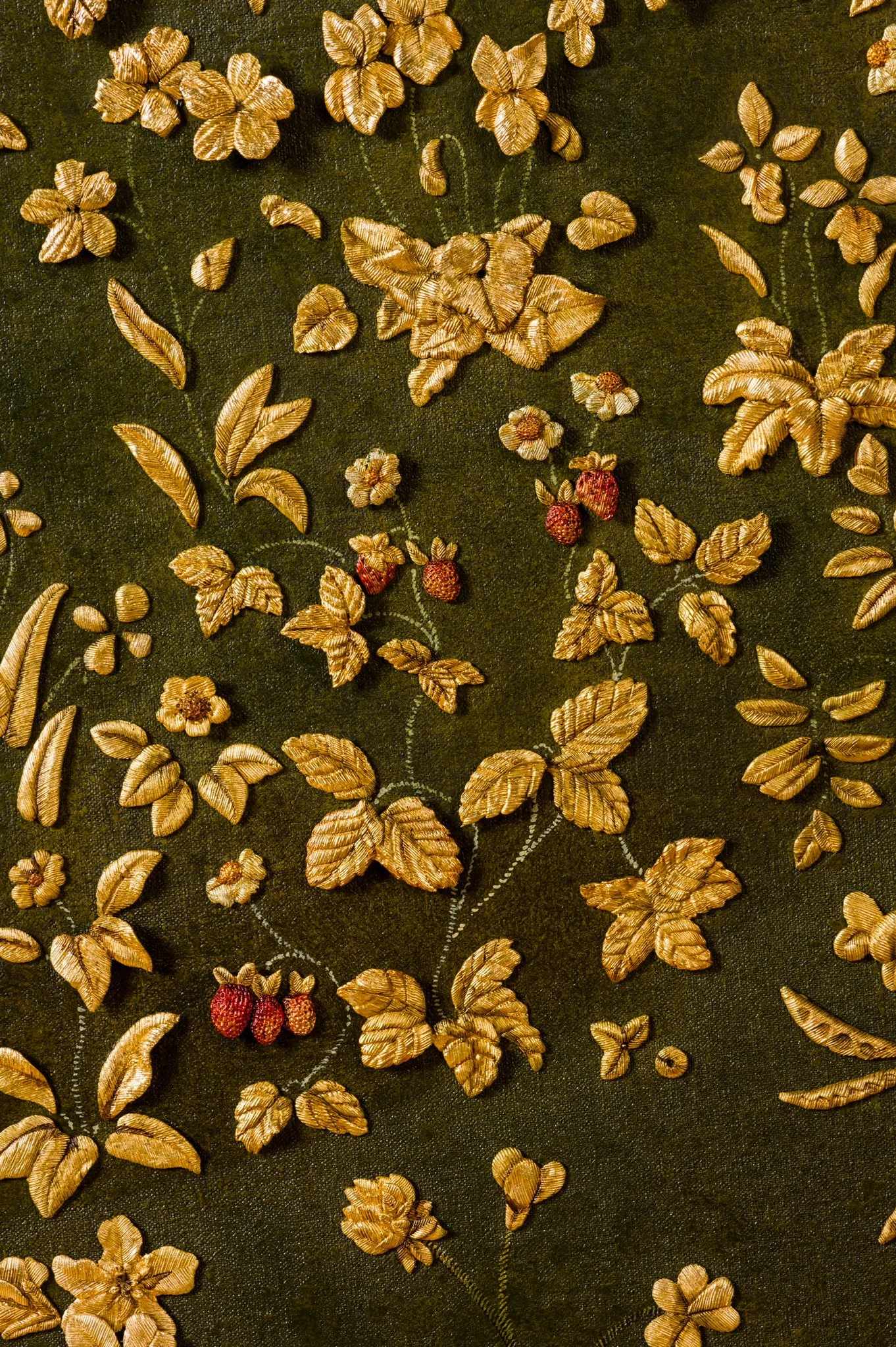 Angelico’s Dream is a framed sphere of hand-tooled, painted flowers, strawberries and moths that are cast and gilded before being arranged into a jewelled tangle on a deep green bronze linen ground.